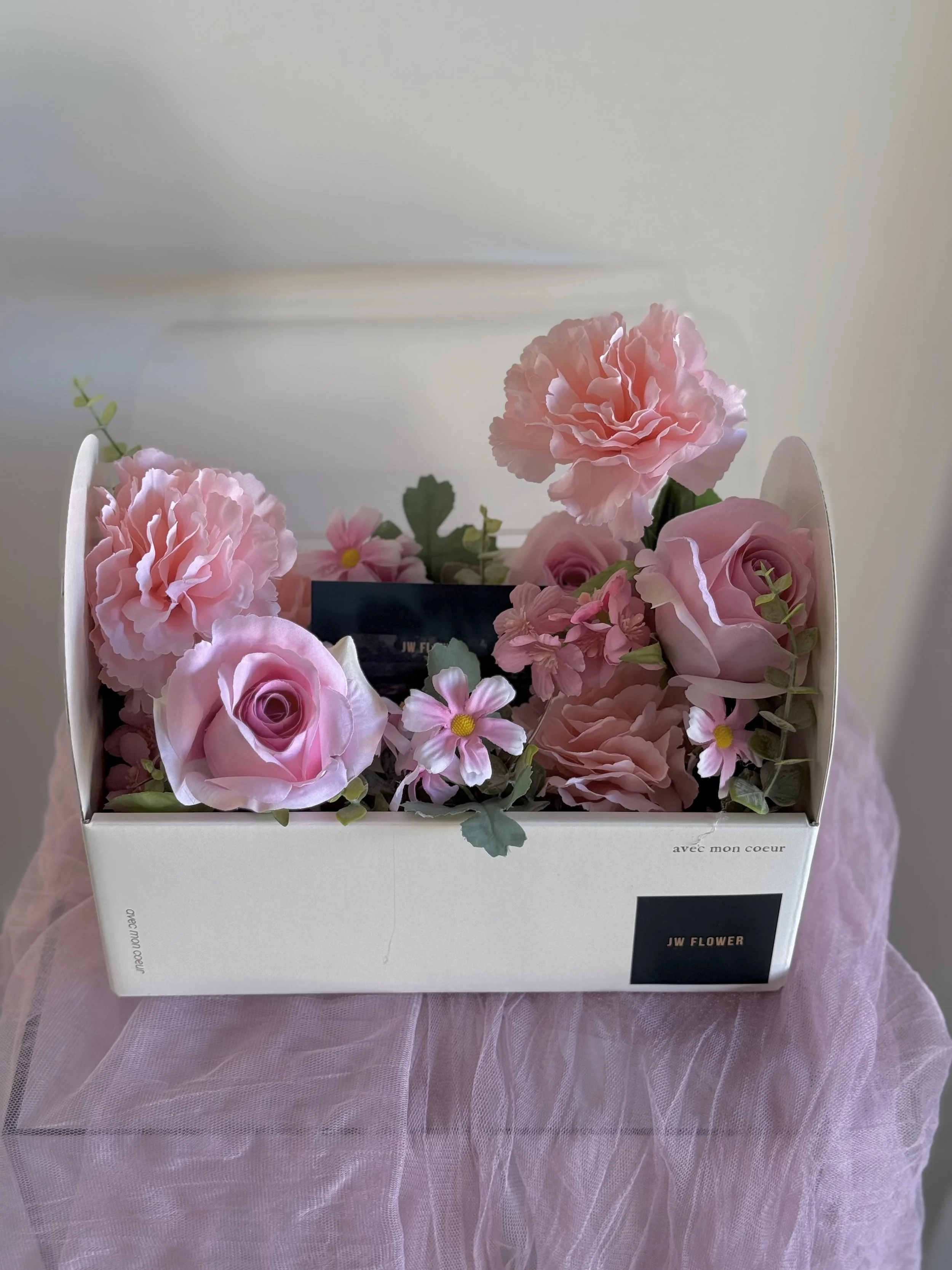 Open the box to reveal a beautiful arrangement of artificial flowers